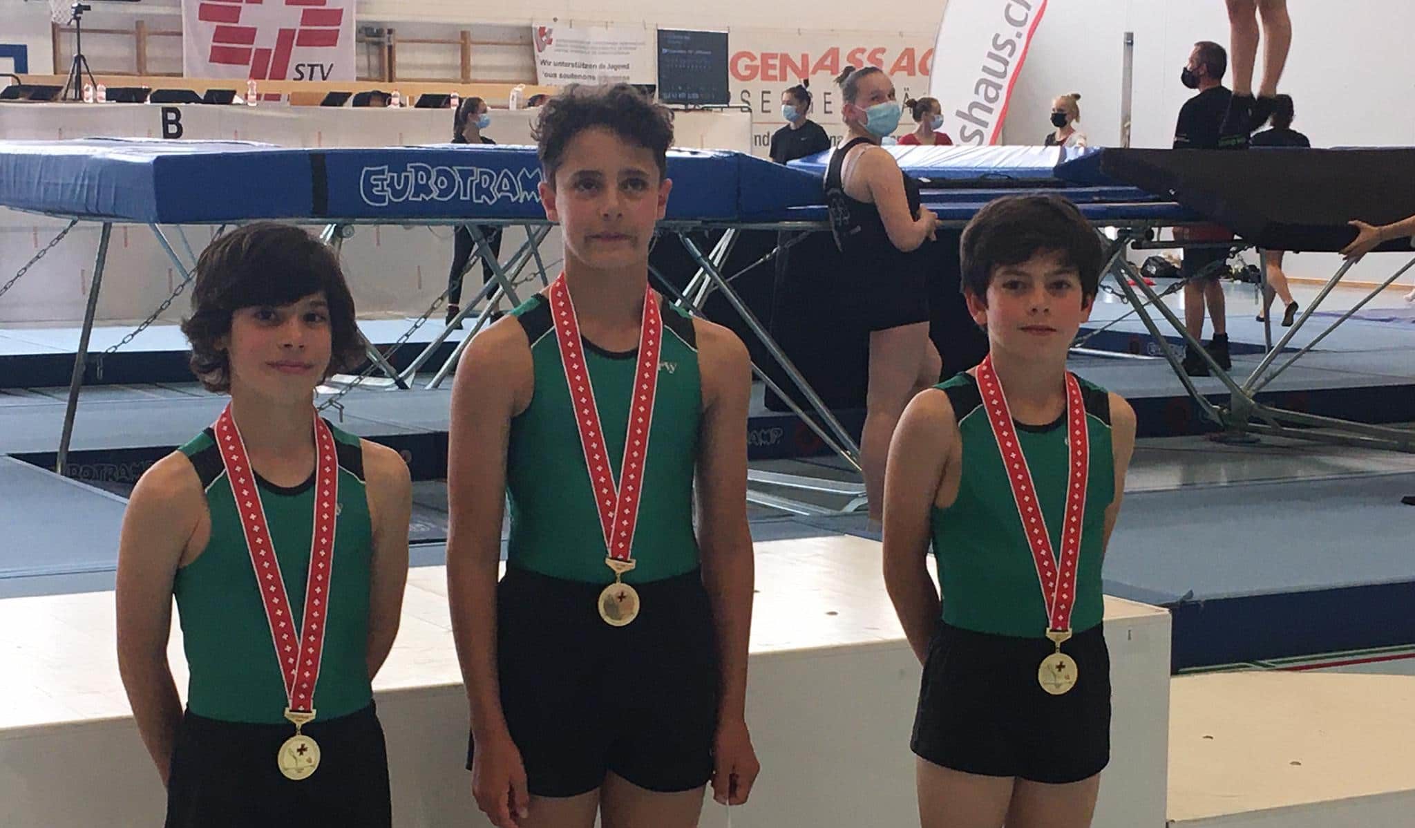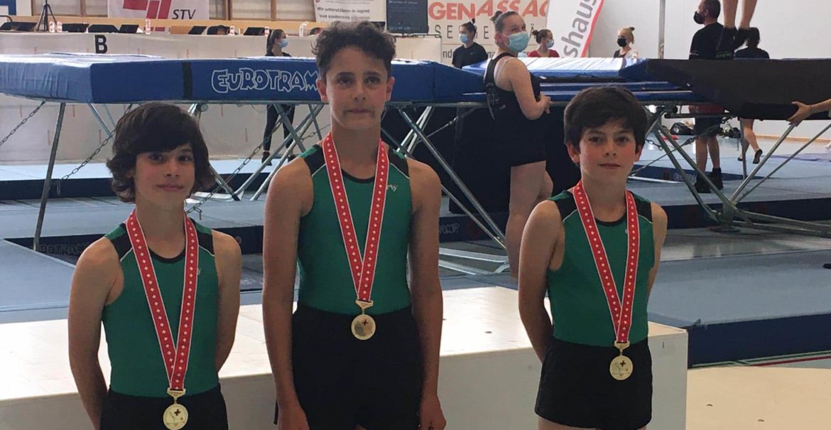 Dans mon dernier rapport, je parlais du suspens dans cette catégorie, et bien, il y en a eu ! Des épreuves qualificatives plutôt moins bonnes que d’habitude, Axel réalise 56.000 points et le petit zurichois qui a beaucoup progressé fait 56.600 points. Le concurrent sérieux du TV Grenchen commet une erreur importante et est écarté de la finale. Tout se jouera donc à la finale où les scores redémarrent à zéro. Axel ayant une difficulté moindre devait jouer sur l’exécution s’il voulait l’emporter. Les 2 zurichois présentaient des libres plus consistants. C’est finalement Axel qui gagne avec une exécution meilleure que ses rivaux du ZTV. Avec 29 points, Axel devance et gagne le titre ! Axel repart pour une saison en U11 en 2022, avec beaucoup de nouveaux éléments à travailler !