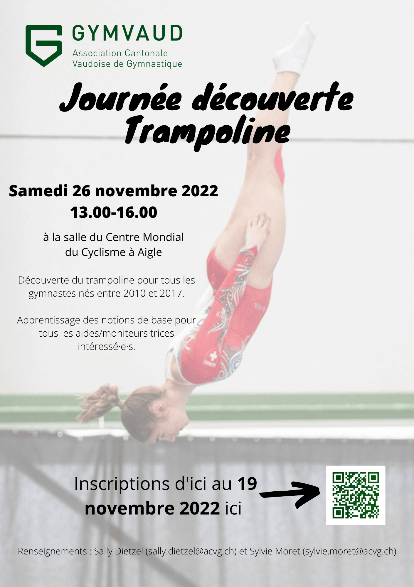 GymVaud a le plaisir d’organiser gratuitement une journée découverte du trampoline à tous les enfants des sociétés de gymnastique du canton, le samedi 26 novembre 2022 de 13:00 à 16:00 au CMC d’Aigle (Centre Mondial de Cyclisme).
